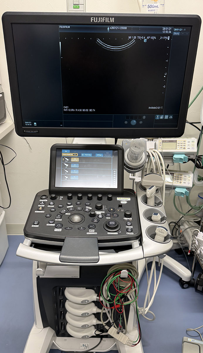 超音波検査機器です。ワンちゃんや猫ちゃんに負担をかけず、非侵襲的に心臓やお腹の中の状態を詳しく検査することがきます。