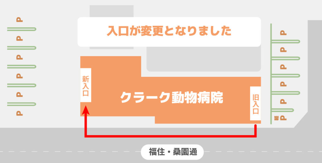 これまでご利用いただいていた西側の入口から、建物東側の入口へ変更となりますので、ご来院の際はお間違えのないようご注意ください(詳細は図をご参照ください)。