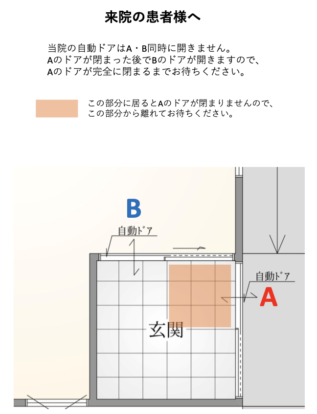 特に複数名でご来院の際は、ドア付近に集中せず、少し離れた場所でお待ちくださいますようお願いいたします。