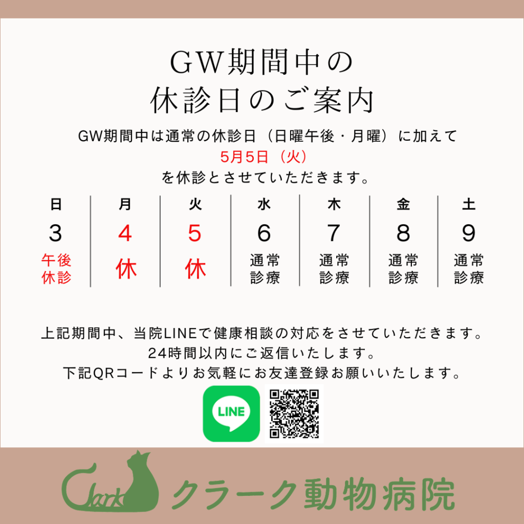 ゴールデンウィーク期間中の診療についてお知らせいたします。当院は、通常の休診日である「日曜午後・月曜日」に加え、5月5日(火)を休診日とさせていただきます。上記以外の日程につきましては、通常通り診療を行っております。何卒よろしくお願い申し上げます。 ご予約・お問い合わせ 気になる症状がございましたら、お気軽にご相談ください。ご予約はWeb・お電話・LINEから承っております。※Web予約の枠が埋まっている場合でもご予約いただける場合がございます。お電話011-799-1080までご連絡くださいませ。 Web予約 電話予約 LINEで予約
